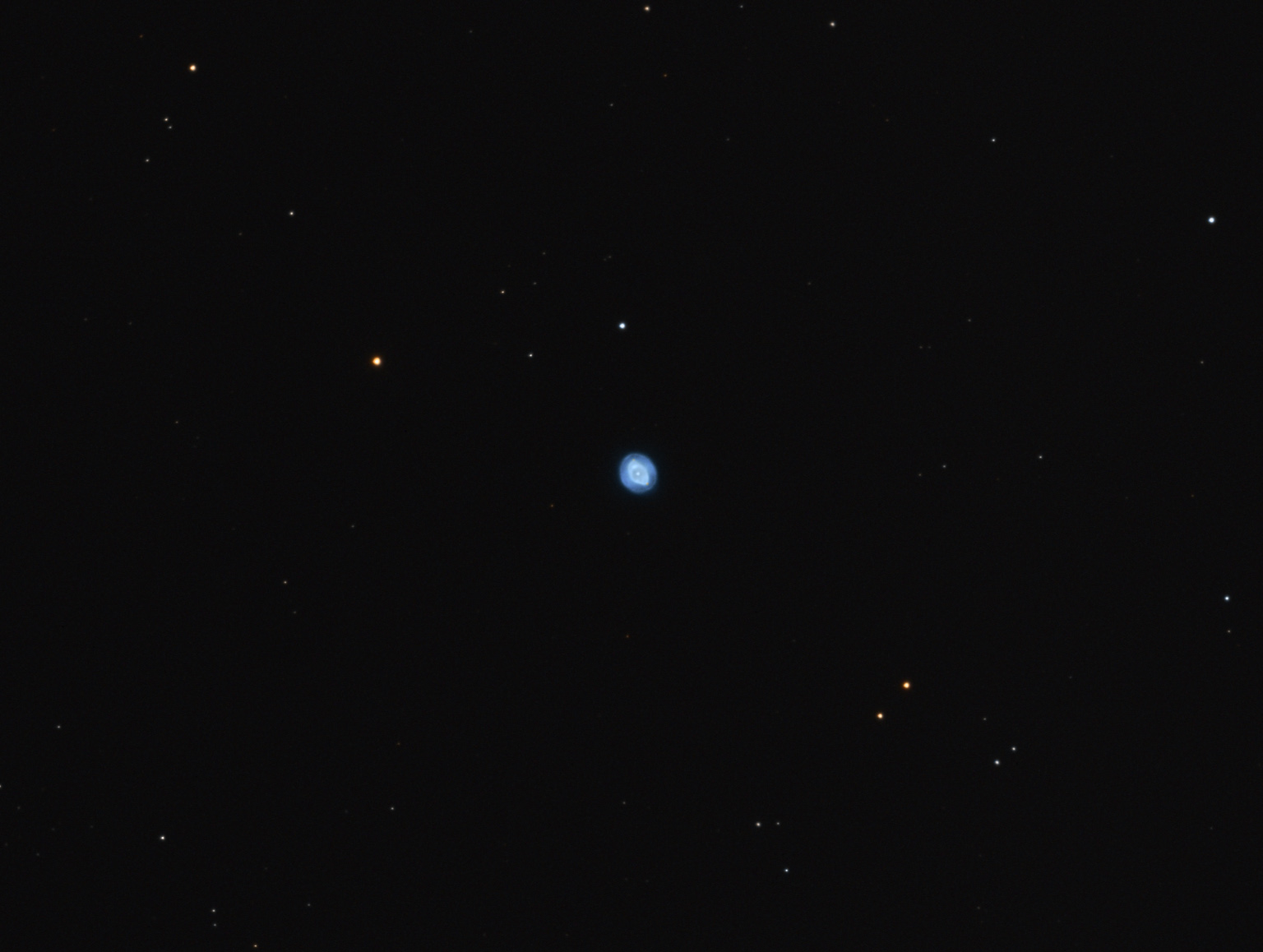 La nebulosa planetaria se observa casi en el centro , donde parece verse una estrella muy brillante , lo que le rodea en colores anaranjado e iluminada por la estrella , no es parte de la nebulosa , puede ser una nube interestelar cercana que se acerca o se aleja , también puede ser una cascara de gas y polvo que fue expulsado en su momento por la estrella moribunda en su centro . Crédito : NOAO .
